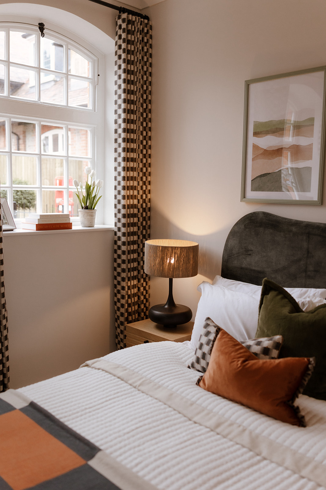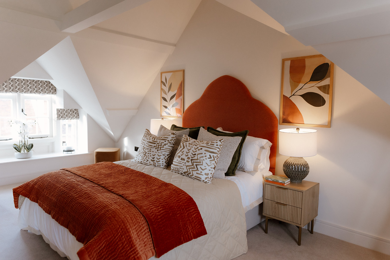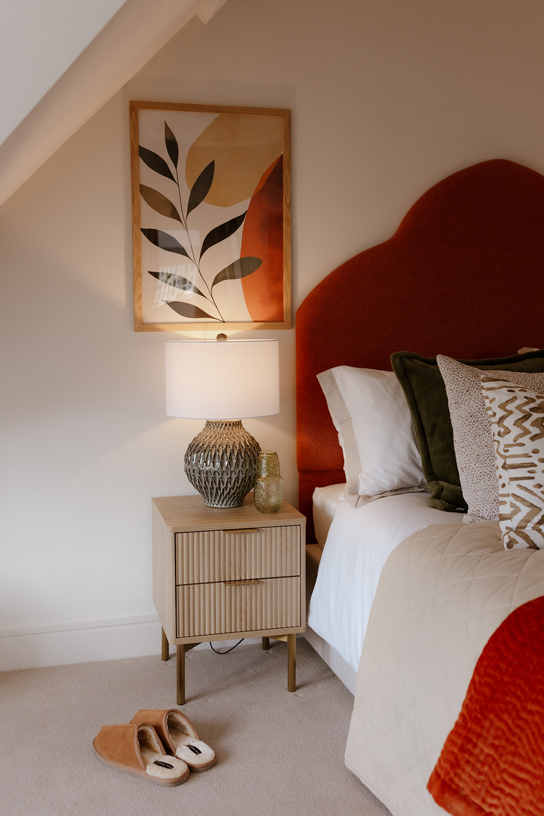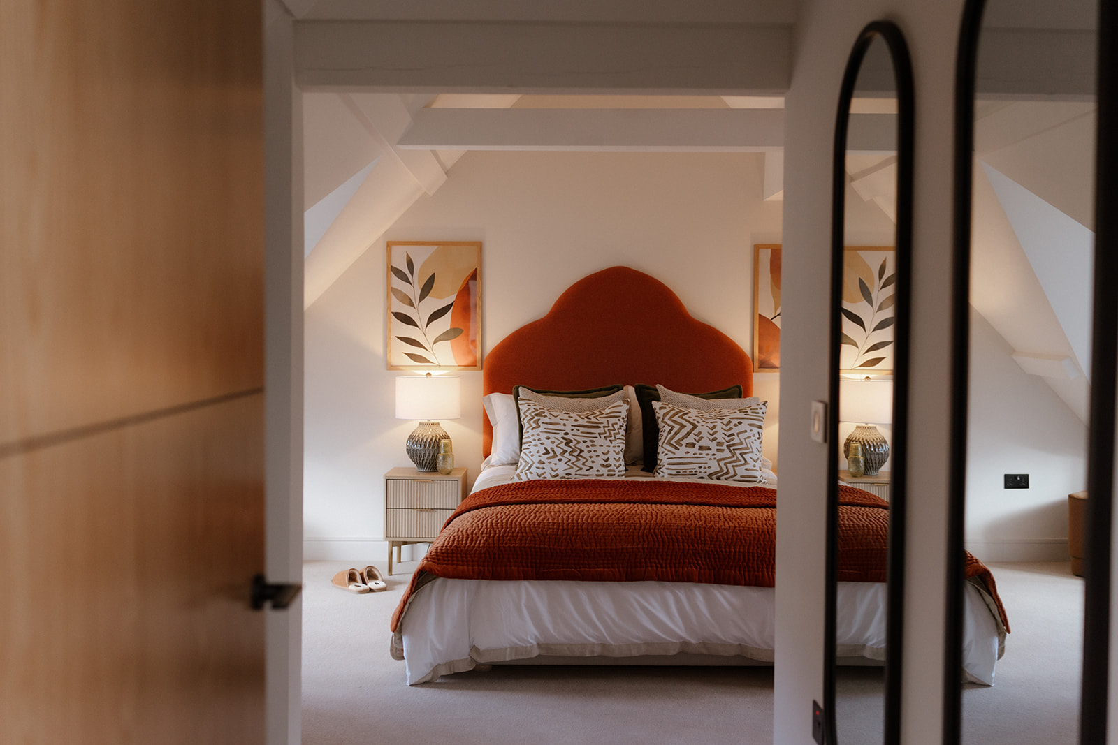 I designed the property in the autumn, so I guess the trees and surrounding grounds were a strong influence.  The kitchen had already been chosen and was a beautiful shade of green so that tied in nicely with the burnt orange.  I introduced some accents of charcoal which tied in the leaded windows.  Because this is a family home I wanted to create a fun and vibrant feel so the bold use of colour and quirky details with headboard shapes that I had made bespoke to the scheme gave that fun element.