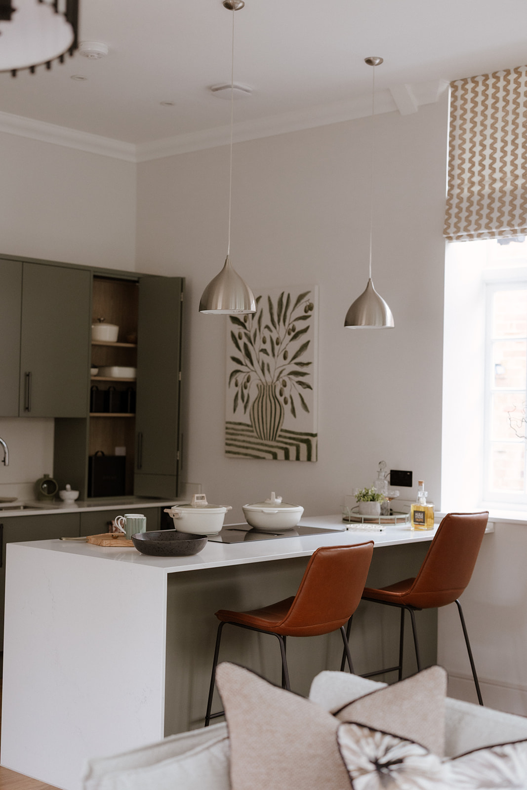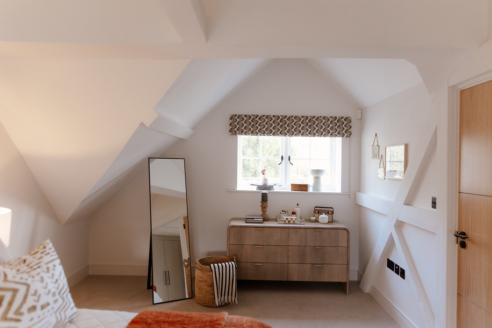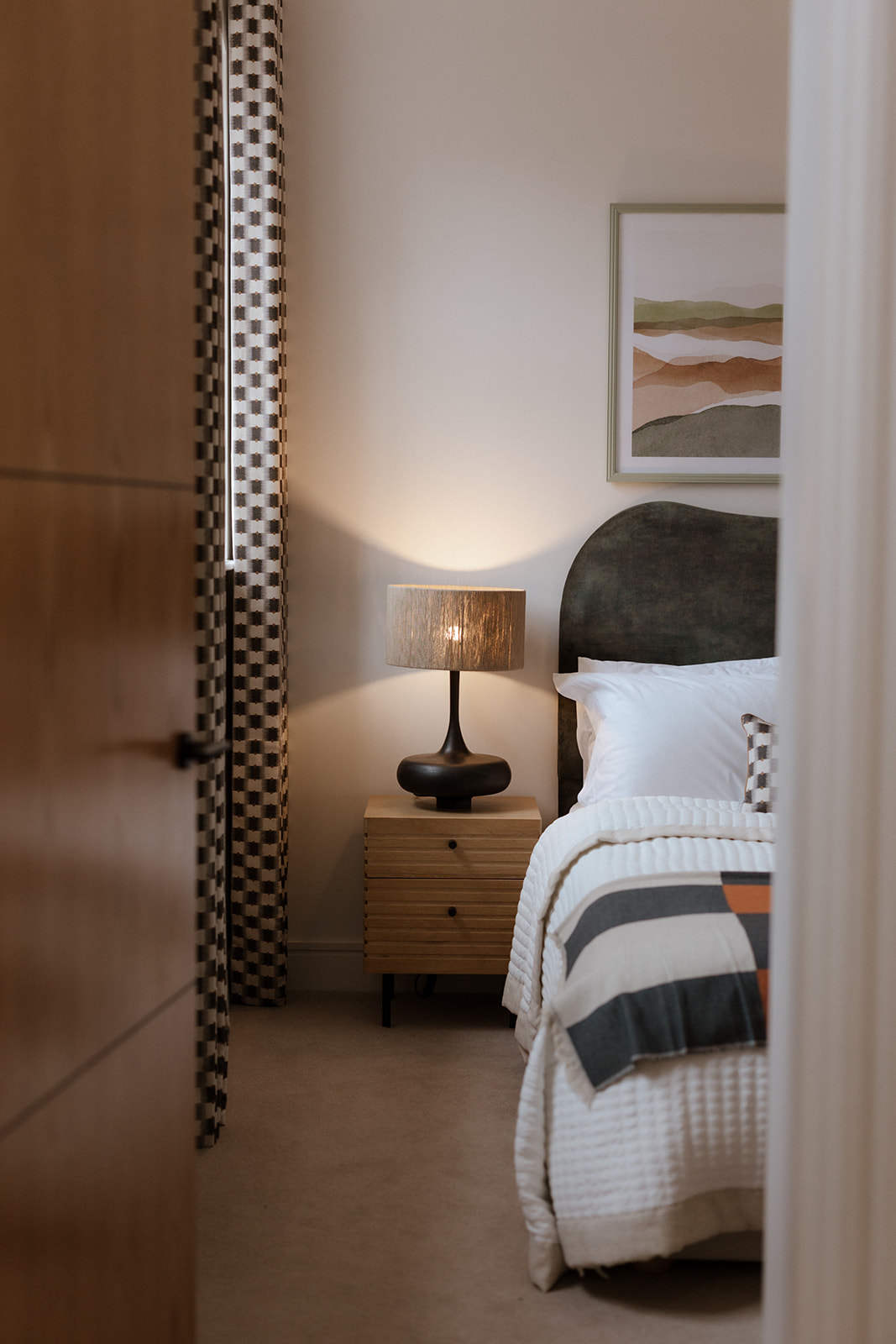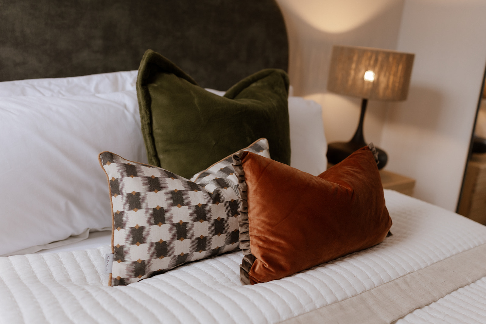 I designed the property in the autumn, so I guess the trees and surrounding grounds were a strong influence.  The kitchen had already been chosen and was a beautiful shade of green so that tied in nicely with the burnt orange.  I introduced some accents of charcoal which tied in the leaded windows.  Because this is a family home I wanted to create a fun and vibrant feel so the bold use of colour and quirky details with headboard shapes that I had made bespoke to the scheme gave that fun element.
