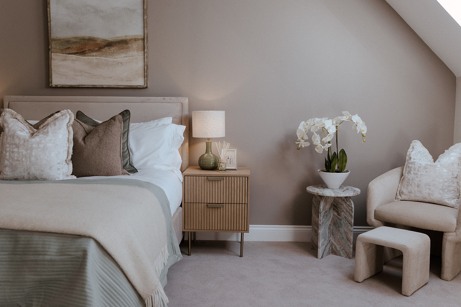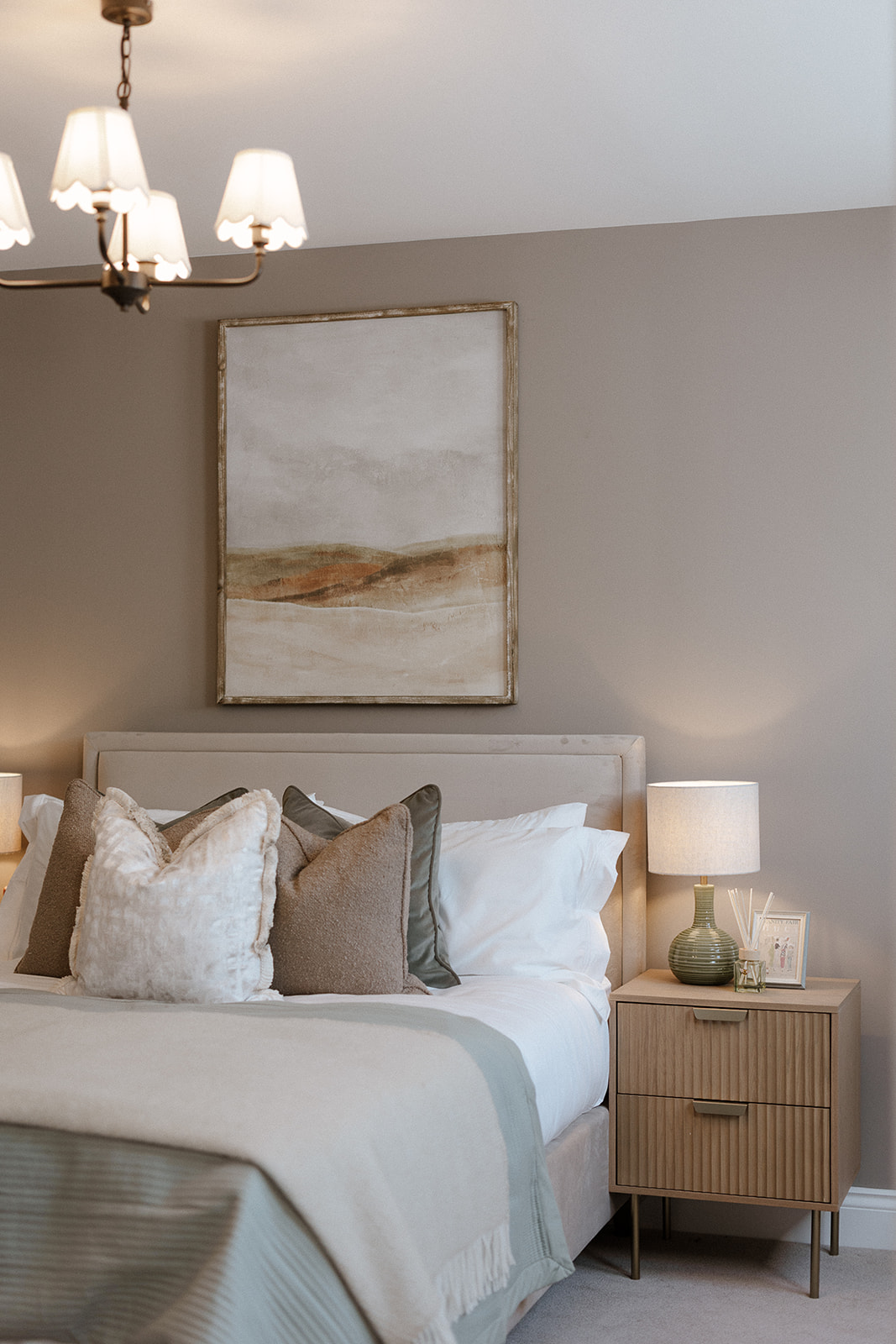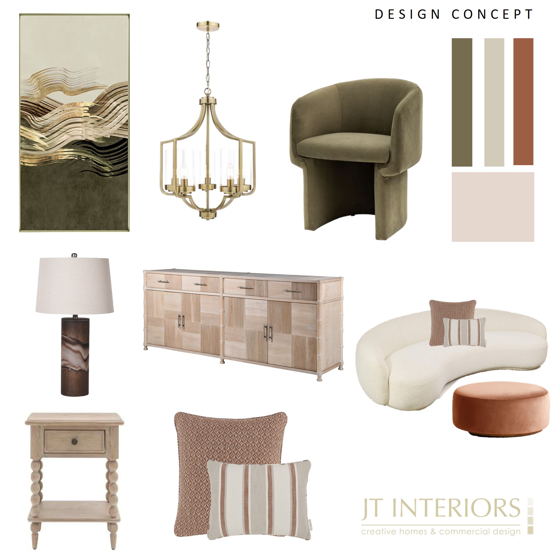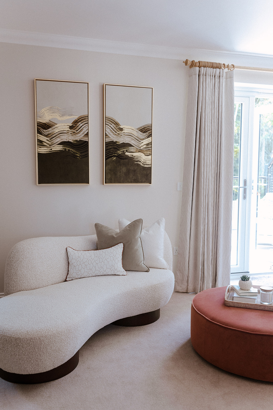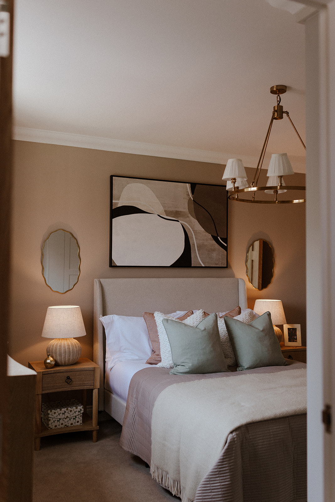 First of all I start with a colour palette. I took inspiration from a piece of contemporary artwork I liked, which had lots of warm earthy tones. I drew on all the colours from the picture and used them throughout the home, to a lesser or greater extent in each room. This allows the whole house to flow seamlessly whilst allowing each room to have it’s own personality.