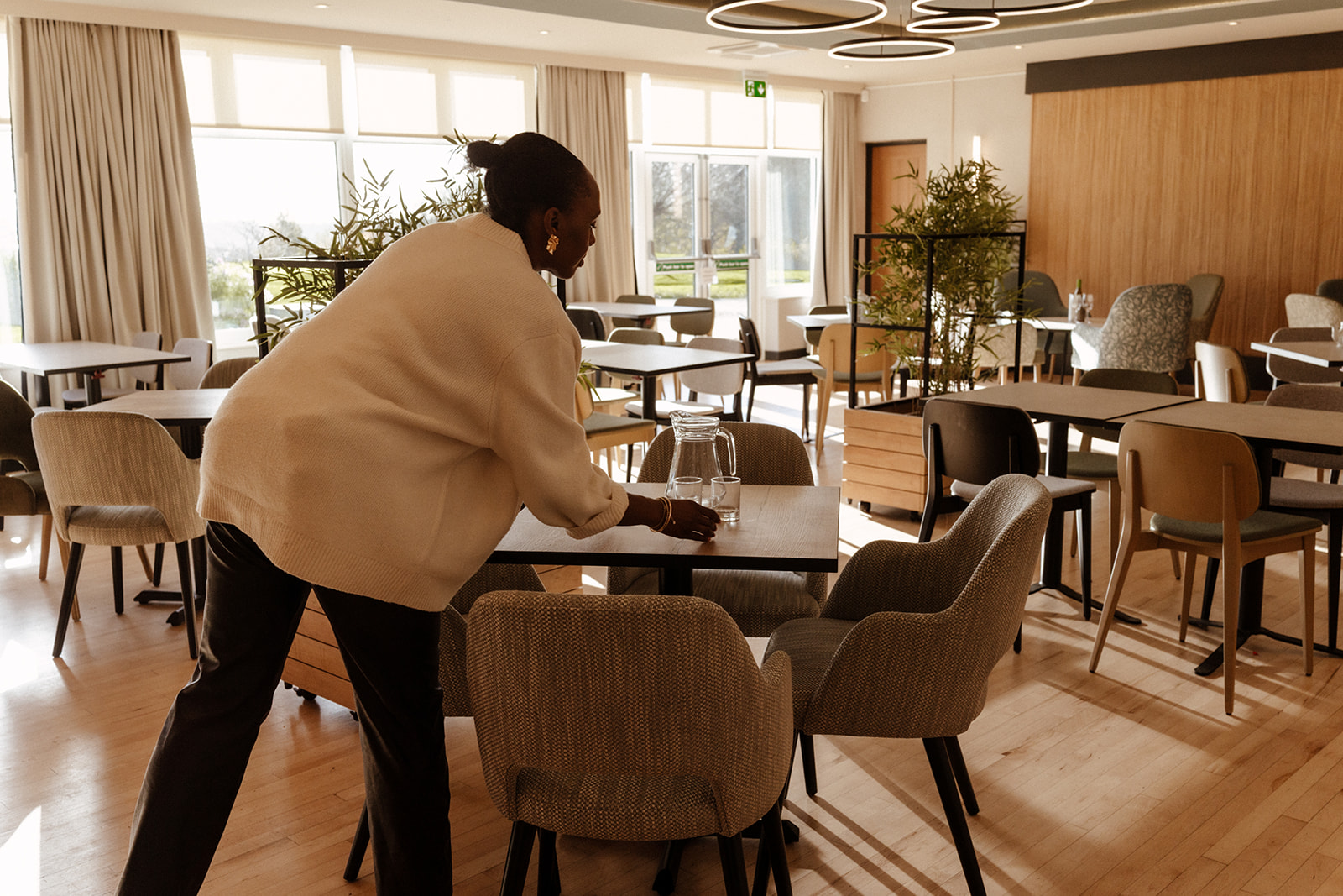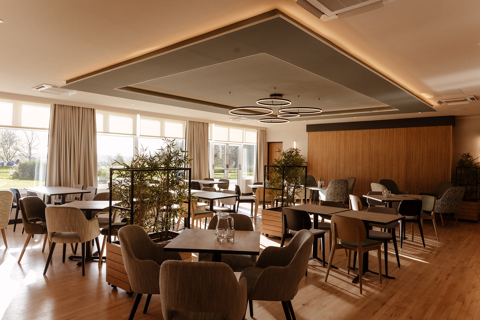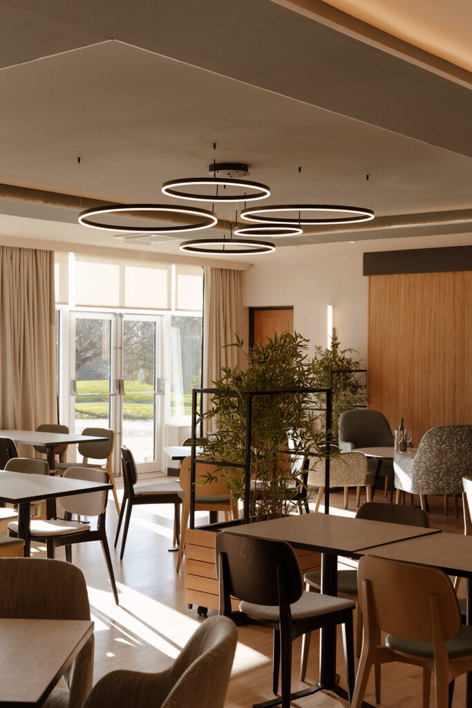 Selecting furnishings which are easy to move around is the first thing. Large inflexible pieces of furniture make moving and repurposing them very awkward. Smaller square tables can be joined for bigger groups, but also provide dining for parties of 2. Chairs of different height and design style help to break the space up visually, but also help create zones – coffee areas, dining and meeting areas. Lastly, using mobile planters allows the club to physically divide the space and create more privacy for guests when required.
