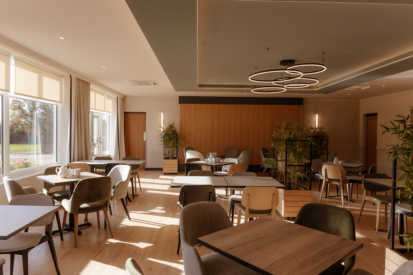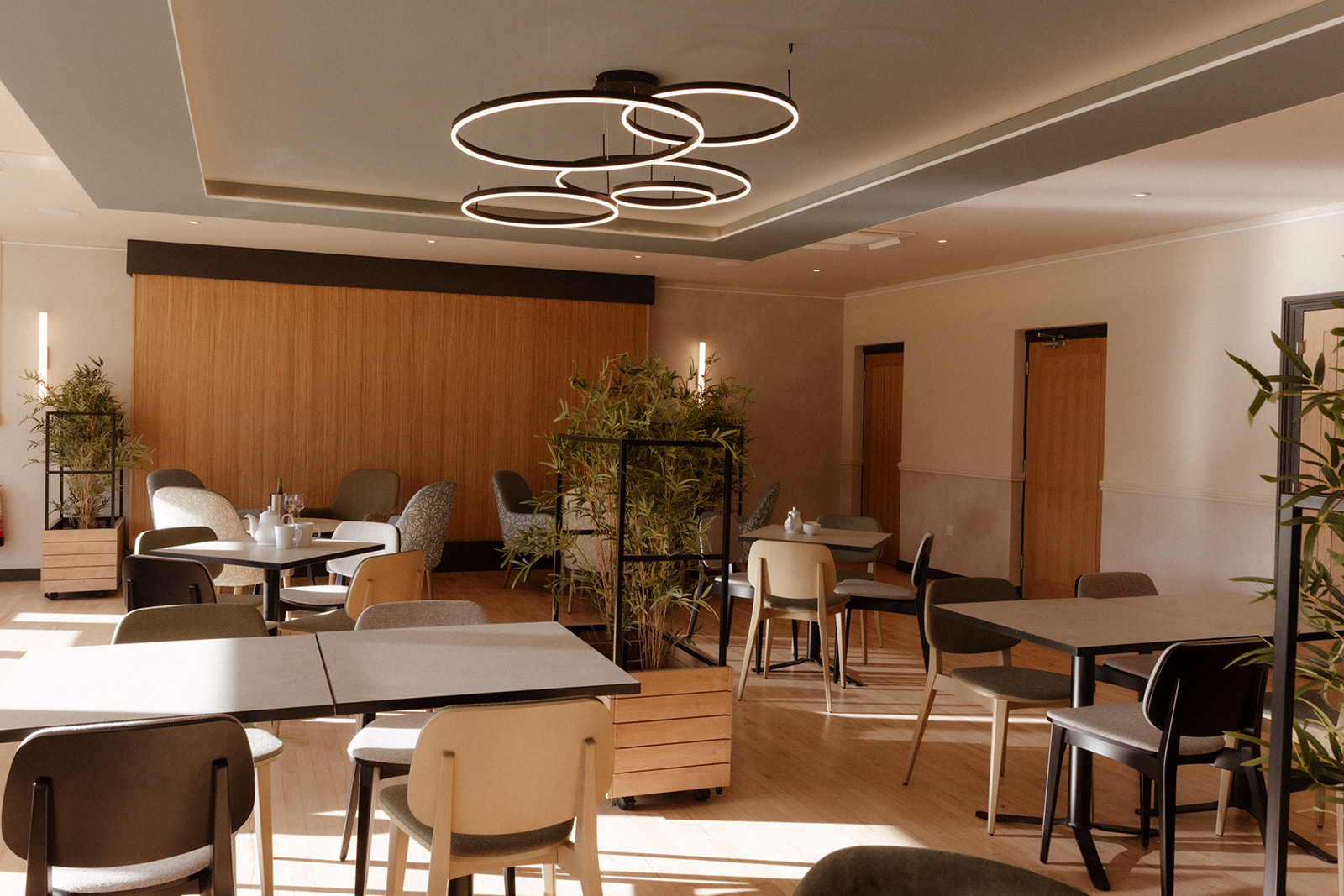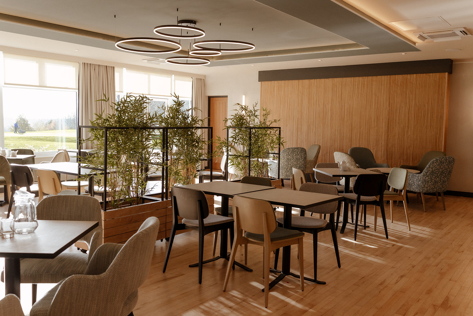 Selecting furnishings which are easy to move around is the first thing. Large inflexible pieces of furniture make moving and repurposing them very awkward. Smaller square tables can be joined for bigger groups, but also provide dining for parties of 2. Chairs of different height and design style help to break the space up visually, but also help create zones – coffee areas, dining and meeting areas. Lastly, using mobile planters allows the club to physically divide the space and create more privacy for guests when required.