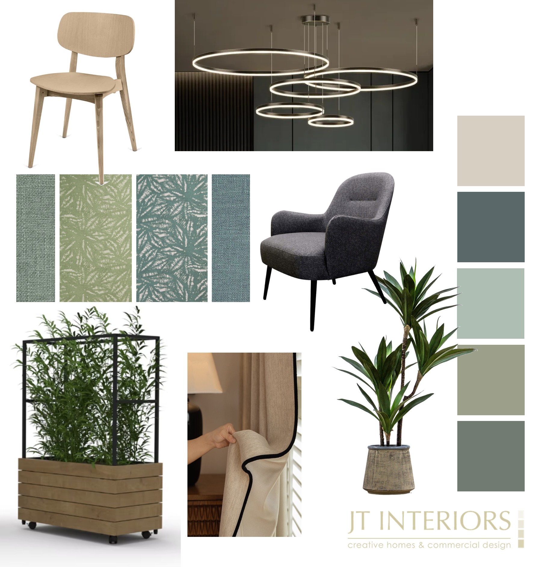 It’s true, the room had many thoroughfares. The mobile planters will also entrances to be disguised a little or seating areas to be shielded from the comings and goings. We added wall paper and texture wood panelling on the feature wall to give the room more depth and create a softer feel that simple painted walls. We also added simple, neutral full length curtains to soften the scheme – these don’t detract from the view beyond in the day, and in the evening they seamlessly blend in with the walls – with LED downlights above to give them a warm glow.