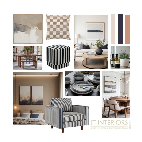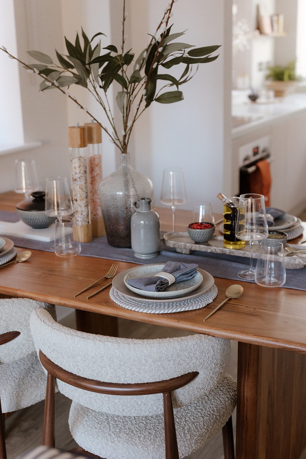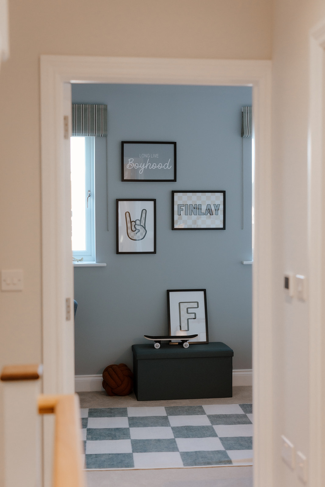 Firstly I created one of the bedrooms to be for a teenage boy – that allowed me to get creative with the furnishings and accessories and really inject some personality for the ‘imaginary’ teenage son of the family.  In the living room, I added touches like occasional chairs in a striped fabric, rather than just having neutral chairs.  The palette for the house combined different shades of blue which complimented the kitchen and created a cool neutral as a backdrop throughout the house.