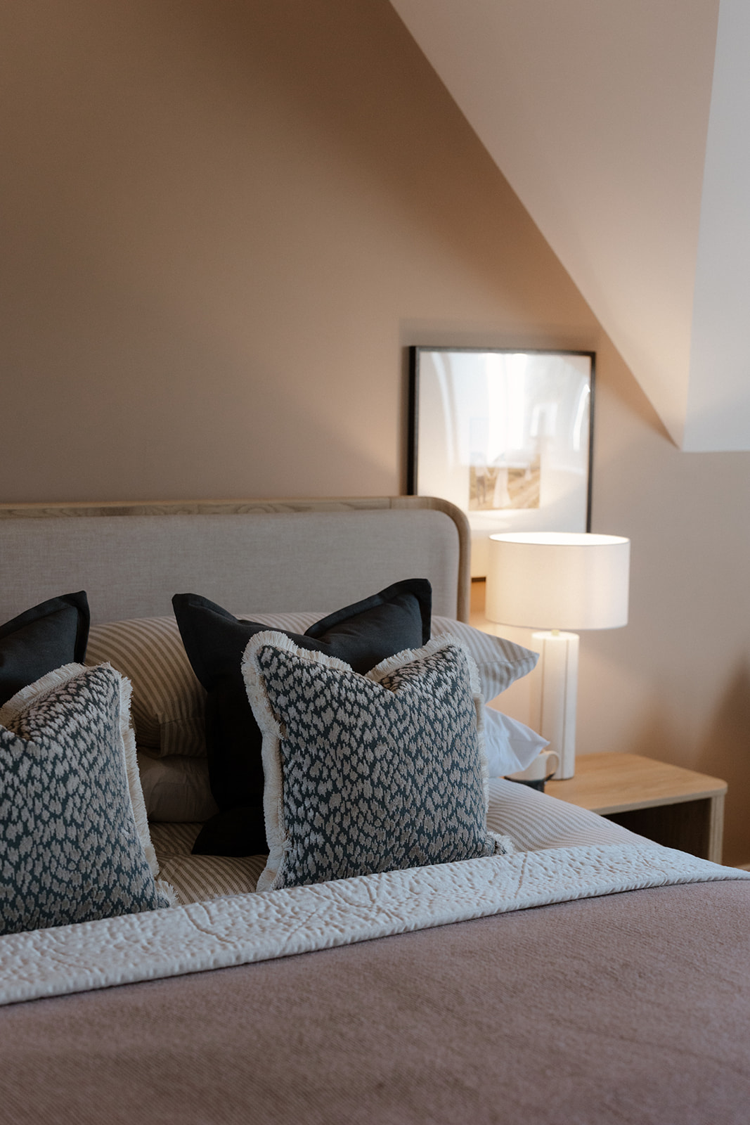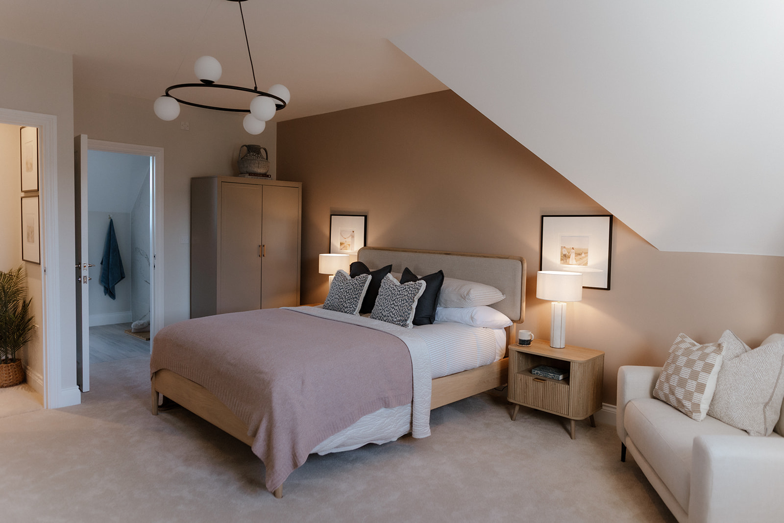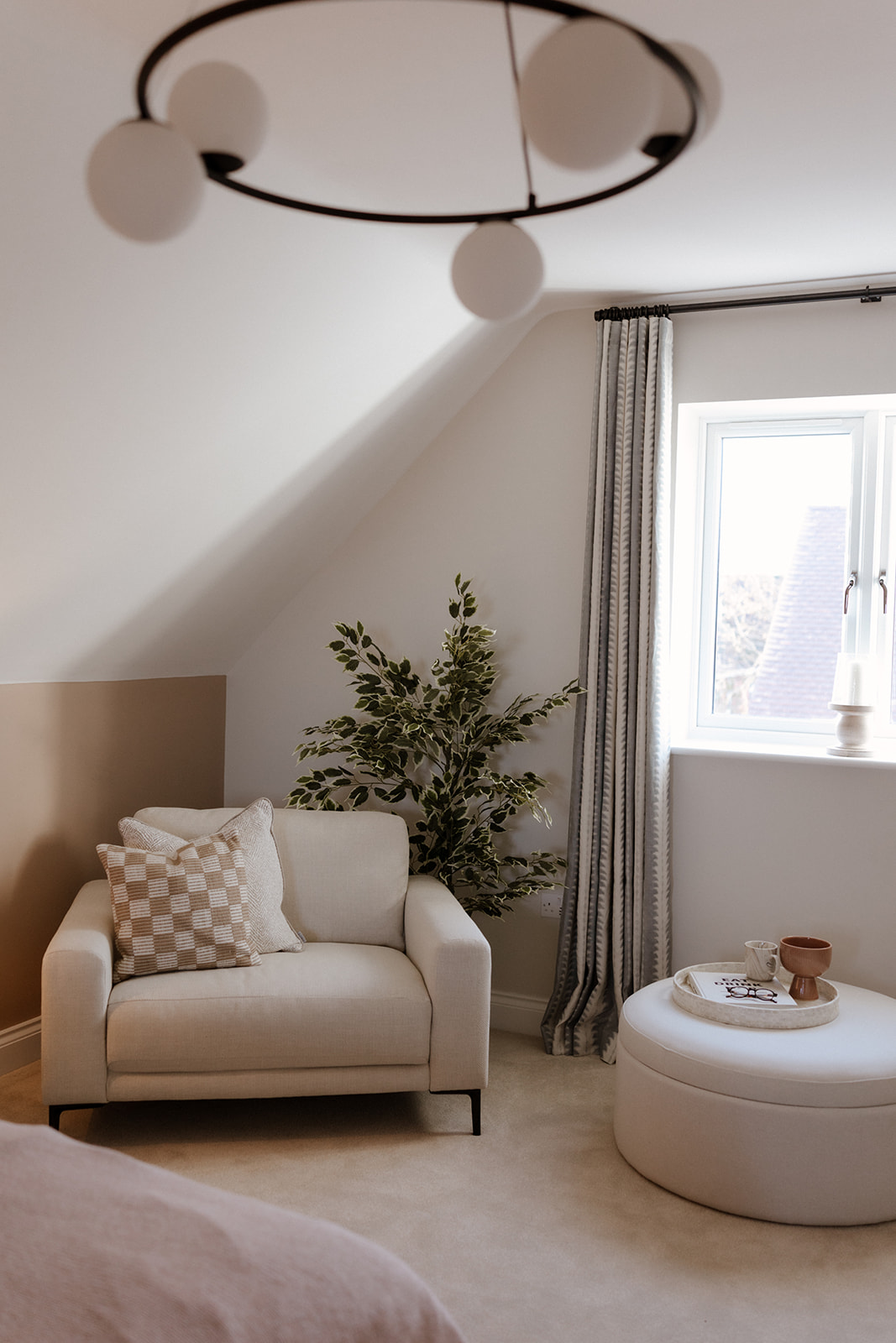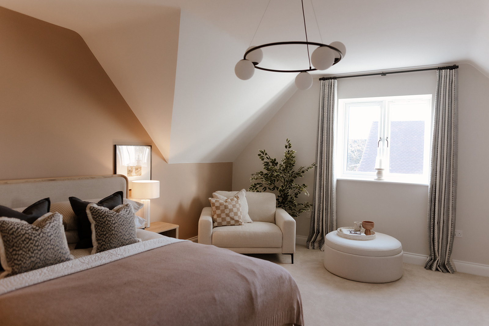 This room was in the eaves and therefore had height restrictions in a number of areas.  One of the main purposes of a show home is to demonstrate how each room can be utilised and furnished, so it was really important that I made use of all the corners and potentially awkward spaces – I added an oversized cuddler chair to one corner and filled the area of the room with restricted height with a large chest of drawers to show how the space could be utilised for storage.  The room was also very wide so we introduced a super king bed to add a boutique hotel feel.