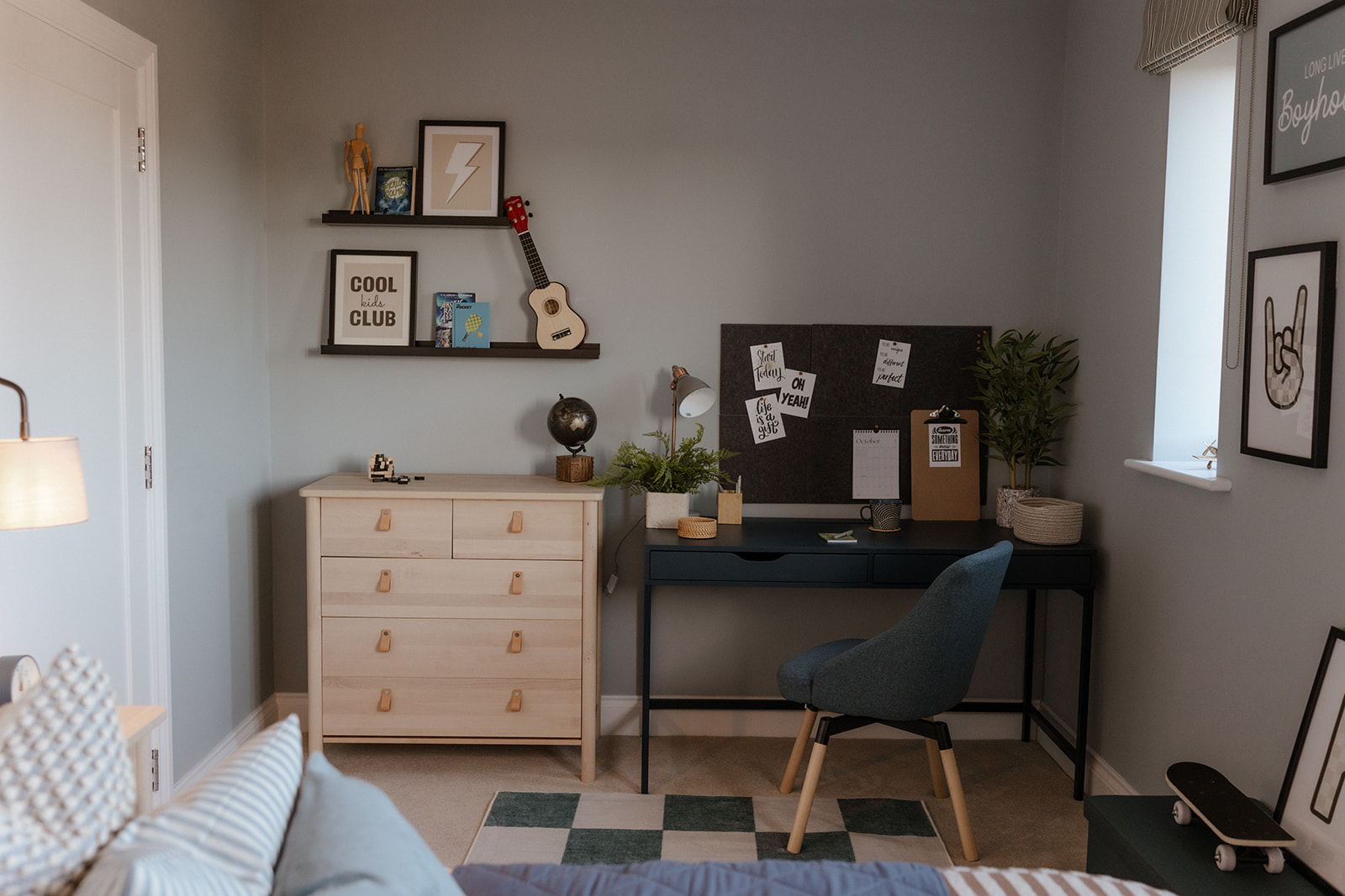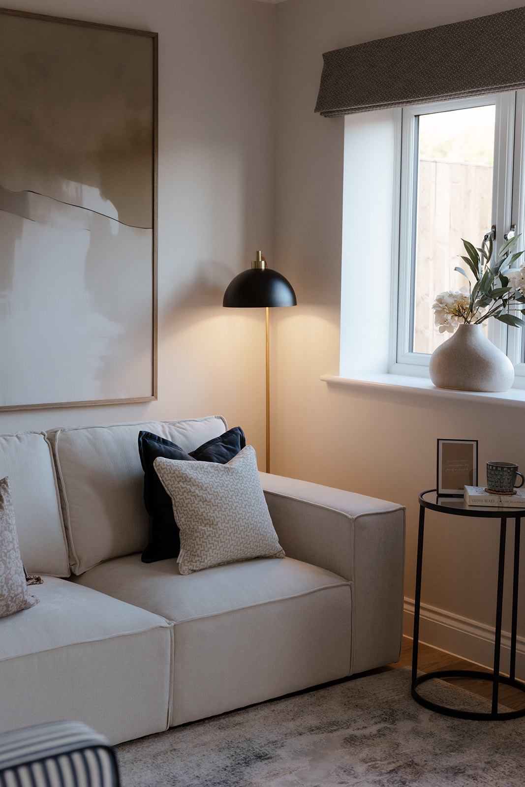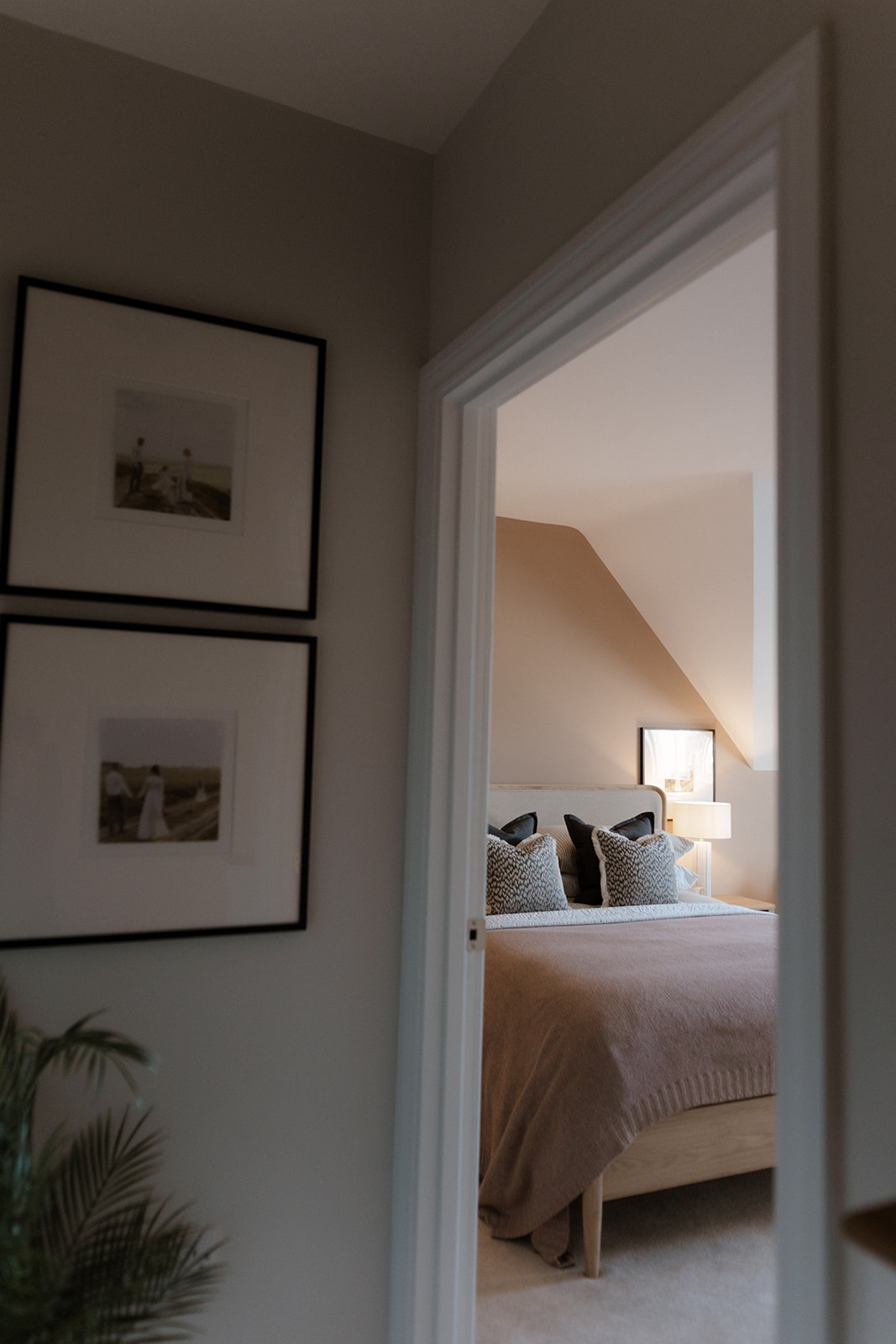 This room was in the eaves and therefore had height restrictions in a number of areas.  One of the main purposes of a show home is to demonstrate how each room can be utilised and furnished, so it was really important that I made use of all the corners and potentially awkward spaces – I added an oversized cuddler chair to one corner and filled the area of the room with restricted height with a large chest of drawers to show how the space could be utilised for storage.  The room was also very wide so we introduced a super king bed to add a boutique hotel feel.