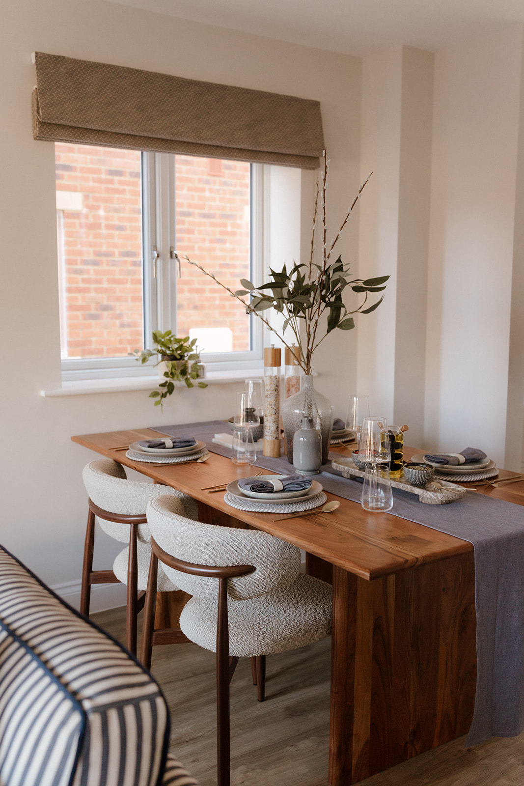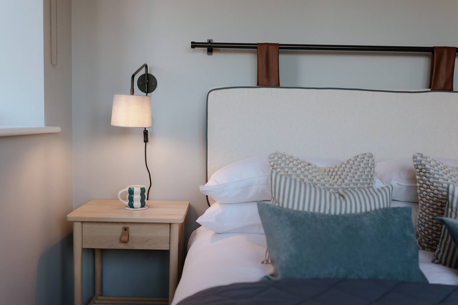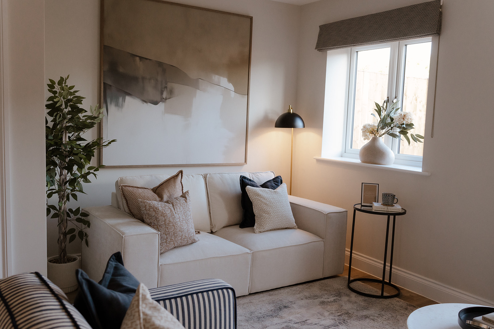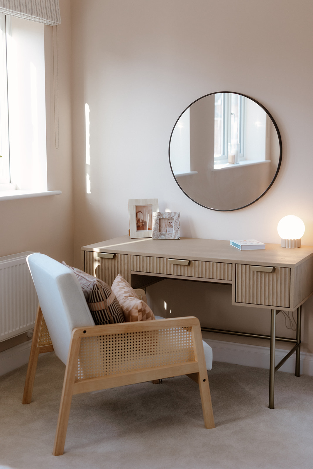 This room was in the eaves and therefore had height restrictions in a number of areas.  One of the main purposes of a show home is to demonstrate how each room can be utilised and furnished, so it was really important that I made use of all the corners and potentially awkward spaces – I added an oversized cuddler chair to one corner and filled the area of the room with restricted height with a large chest of drawers to show how the space could be utilised for storage.  The room was also very wide so we introduced a super king bed to add a boutique hotel feel.